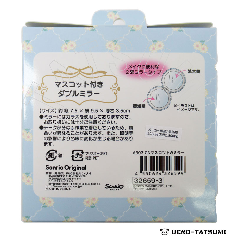 シナモロール マスコット付きダブルミラー シナモロール マスコット付きダブルミラー (CR048) 定価(税込) ¥1,980 販売価格(税込) ¥1,700 在庫状態 : 在庫僅少 数量 シナモロールのダブルミラーです。 拡大鏡と普通鏡の2面ミラータイプ。 サイズ:約7.5cm×1.5cm×7.5cm(キャラクター含まず) パッケージサイズ:約10.3cm×4.5cm×10.3cm 素材はガラス、ポリエステルを使用。 関連商品 シナモロール ボアルームシューズ シナモロール ミニクリップ 4個セット シナモロール ランチボックス 3個セット シナモロール ランチクロス くま